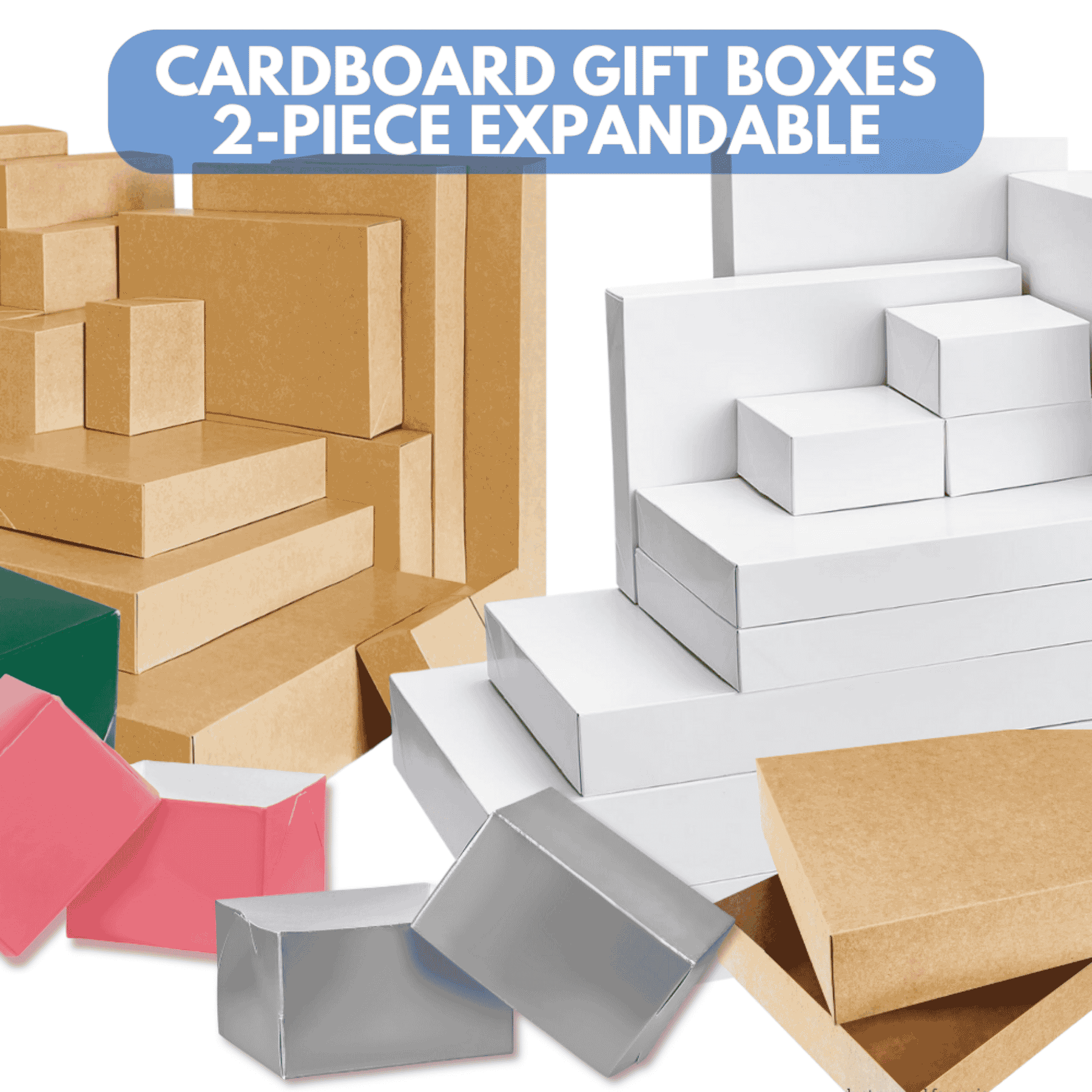 - Two-piece expandable cardboard gift boxes are made from sturdy, white-lined board for a premium feel. With 30% post-consumer content, they are eco-friendly, customizable to showcase your brand, durable, easy to assemble, and available in many colors.